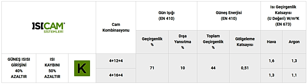 TS 825 Isı Yalıtım Kuralları Standardı’nda yeni binalar için tavsiye edilen Up= 2,4 W/m²K değerine (pencerelerin cam+doğrama, ısı geçirgenlik katsayısı), Isıcam S ve Isıcam K ile ulaşılabilmektedir.