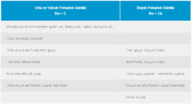Rw (C, Ctr)=40 (-1,-5) değerine sahip bir yapı parçası 40 dB’lik yalıtım performansına sahiptir. Daha yüksek frekanslı gürültü kaynakları için ses yalıtımı 1 dB, düşük frekanslı kaynaklar için 5dB daha düşüktür.