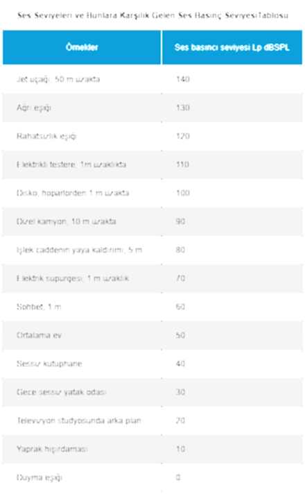 Örnek Gürültü Kaynakları İçin Gürültü Düzeyleri