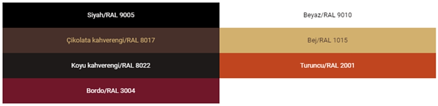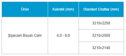 Şişecam Boyalı Cam, standart olarak aşağıdaki renklerde üretilmektedir. İsteğe bağlı olarak farklı RAL renklerinde de üretim yapılabilmektedir.
