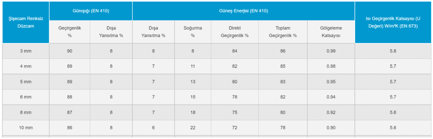 Gölgeleme Katsayısı: Güneş enerjisi toplam geçirgenliğinin 3 mm renksiz camla kıyaslanmasıdır. Daha düşük gölgeleme katsayısı, daha iyi güneş kontrolü demektir.